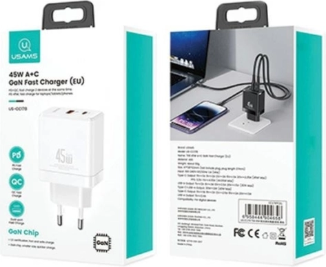 Ładowarka USAMS US-CC178 oferuje dwa różne porty USB, dzięki czemu obsługuje protokoły szybkiego ładowania takie jak QC3.0, AFC i FCP, zapewniając kompatybilność z modelami marek Huawei, Apple, Xiaomi, Honor, OPPO, Samsung i innych. Wysoka moc wyjściowa umożliwia ładowanie większych urządzeń, takich jak laptopy – na przykład MacBook Air można naładować w niecałe dwie godziny!