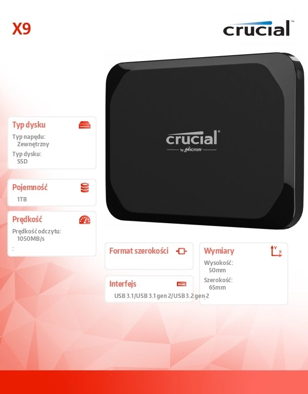 Praktyczny i szybki zewnętrzny dysk SSD Crucial X9 oferuje prędkość do 1050 MB/s, pojemność 1 TB oraz uniwersalne złącze USB‑C 3.2 Gen 2. Jest nawet 7,5× szybszy niż HDD, wytrzymuje upadki z wysokości do 2 metrów i działa jako pamięć plug‑and‑play dla PC, Mac, Androida, tabletów i konsol do gier.