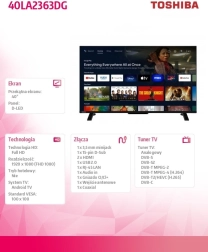 Ciesz się ulubionymi filmami, serialami i wideo na przejrzystym, inteligentnym ekranie domowym z telewizorem LED TOSHIBA 40". Oferuje nowoczesny design z wąską ramką, łatwy dostęp do aplikacji takich jak YouTube i Disney+ oraz wysoką jakość obrazu do codziennej rozrywki. Dzięki inteligentnym funkcjom, stabilnej podstawie i bogatemu zestawowi złączy to idealny wybór do salonu i sypialni. Odkryj smart TV z przejrzystym interfejsem, szybkim streamingiem i smukłą konstrukcją.