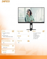 Odkryj wydajność i elastyczność z monitorem AOC 24P3CV. Ten monitor z nowoczesnym designem posiada 23,8" panel IPS, który zapewnia żywe i ostre wyświetlanie. Liczne opcje połączeń, w tym HDMI, DP i USB-C, zapewniają kompatybilność z wszystkimi Twoimi urządzeniami.