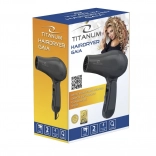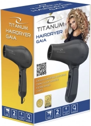 Lekka i kompaktowa podróżna suszarka do włosów TITANUM GAIA o mocy 750 W, z 2 poziomami nadmuchu i składaną rączką, szybko i delikatnie wysuszy włosy w domu i w podróży. Wyposażona w zabezpieczenie przed przegrzaniem oraz praktyczny hak do zawieszenia.