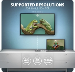 - 1x HDMI (A, żeńskie); do 4K 4096×2160@60 Hz; 2560×1440 do 120 Hz; 1920×1080 do 240 Hz; wymaga USB-C z DisplayPort Alt Mode 1.4+ lub Thunderbolt 3/4; HDR (10 bit), Hot Plug Detect, TMDS, HDCP 1.4/2.3; dźwięk 2‑kanałowy do 24 bit/192 kHz (zależnie od źródła i urządzenia końcowego)