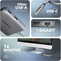 Kompaktowy hub USB-C AXAGON rozszerzy Twój notebook o 5 praktycznych portów: HDMI 4K/60 Hz, Gigabit Ethernet, 2x USB-A 5 Gb/s oraz USB-C Power Delivery do 100 W do zasilania przelotowego. Obsługuje szybkie transfery 5 Gb/s, ładowanie telefonów do 1,5 A, częstotliwości gamingowe do 240 Hz w Full HD oraz DP Alt Mode i Thunderbolt 3/4. Aluminiowa obudowa zapewnia trwałość i skuteczne chłodzenie.