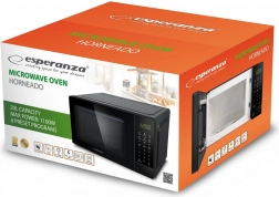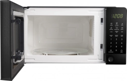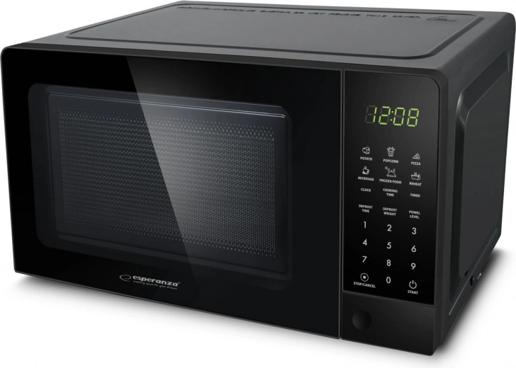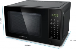 Kuchenka mikrofalowa ma elegancki czarny design, cyfrowy panel sterowania i wyświetlacz umożliwiający łatwe ustawienie funkcji takich jak gotowanie, rozmrażanie i podgrzewanie.