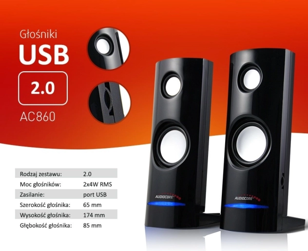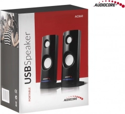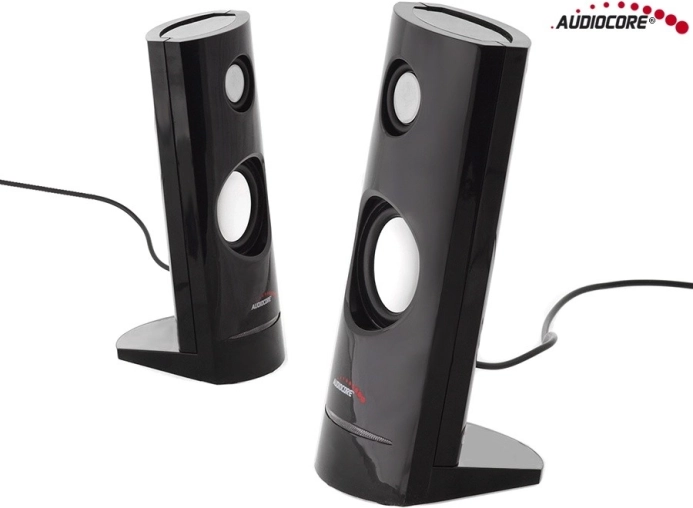 Kompaktowe głośniki stereofoniczne Audiocore AC860 zapewniają czysty i naturalny dźwięk dla laptopów i komputerów stacjonarnych. Dzięki zasilaniu USB i połączeniu przez złącze 3,5 mm konfiguracja jest dziecinnie prosta. Eleganckie, wytrzymałe wykonanie świetnie wpasuje się na każdym biurku, a boczny regulator głośności zapewnia wygodne sterowanie.