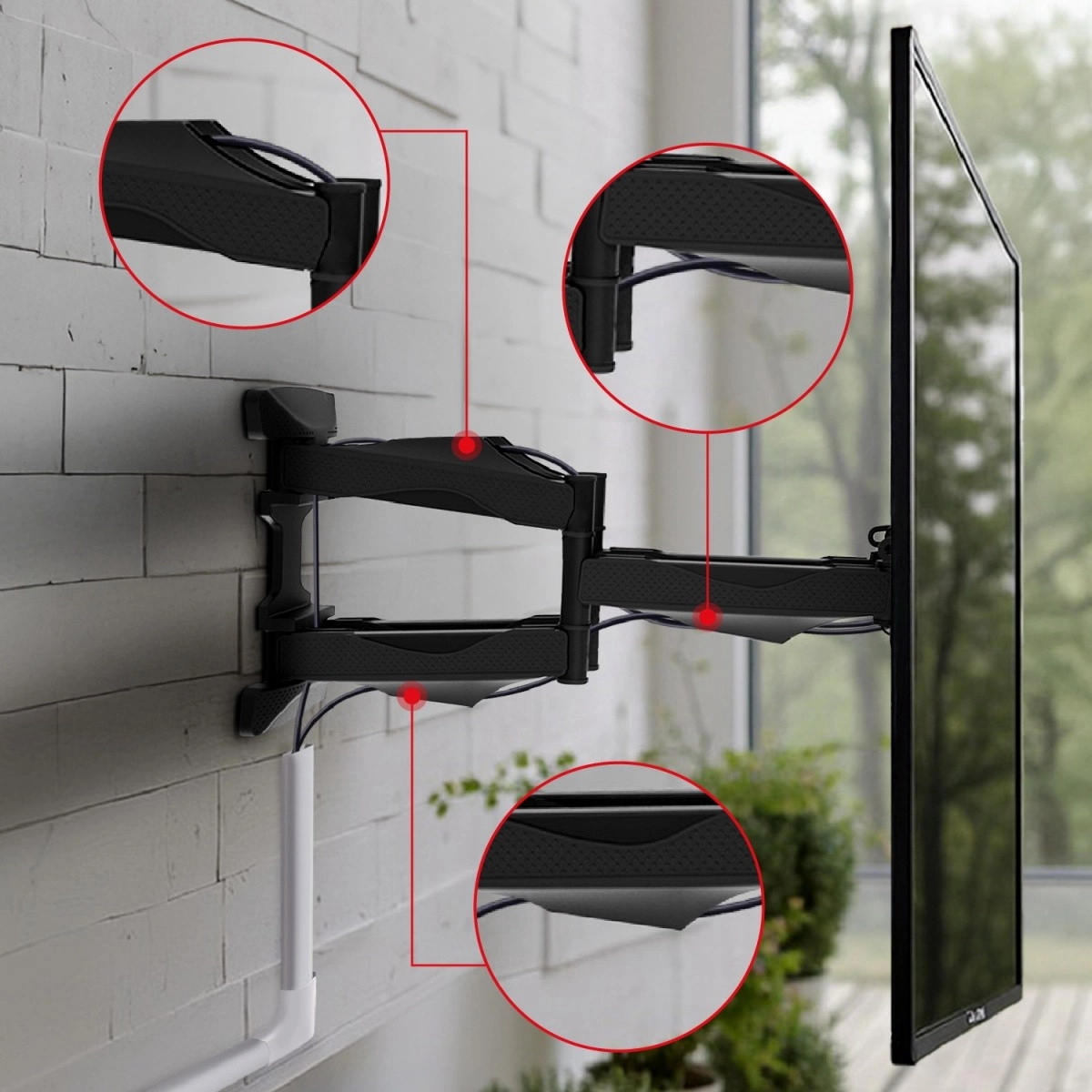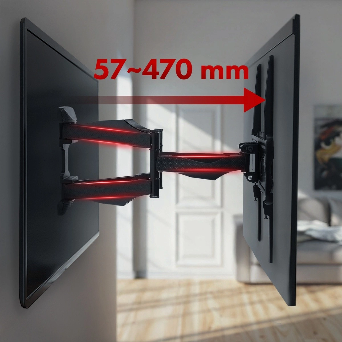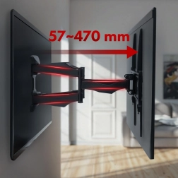 Ten wytrzymały uchwyt ścienny pozwala wygodnie umieścić telewizor w salonie, sypialni czy biurze. Dzięki podwójnemu, przegubowemu ramieniu łatwo odsuniesz TV od ściany 57–470 mm, obrócisz go do pożądanego kąta i pochylisz w zakresie +2° do -12° dla perfekcyjnego widoku bez odblasków.