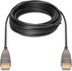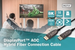 Aktywny hybrydowy kabel DisplayPort 1.4 AOC umożliwia przesył nieskompresowanego obrazu i dźwięku na długie odległości z przepustowością do 32,4 Gb/s, rozdzielczością do 8K przy 60 Hz oraz wsparciem HDR. Dzięki połączeniu światłowodów i przewodników miedzianych jest odporny na zakłócenia EMI, ma małą średnicę, łatwy montaż Plug & Play i obsługuje HDCP 2.2, EDID i CEC.