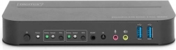 Przełącznik KVM Digitus pozwala podłączyć dwa komputery przez 2× DisplayPort i współdzielić jeden monitor, klawiaturę i mysz. Wyjście można poprowadzić przez HDMI 2.0 lub DisplayPort 1.2 z rozdzielczością 4K@60 Hz, w tym obsługą HDCP 2.2, HDR i FreeSync. Przełączanie możliwe przyciskiem na przednim panelu lub za pomocą dołączonego odbiornika pilota IR.