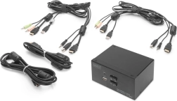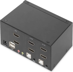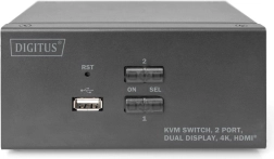 Kompaktowy przełącznik KVM DIGITUS umożliwia wygodne zarządzanie dwoma komputerami z obsługą dwóch zewnętrznych monitorów przez HDMI. Przełączaj się między PC jednym przyciskiem lub skrótem klawiszowym, bez konieczności ciągłego przepinania kabli. Przełącznik jednocześnie przełącza także audio (mikrofon/słuchawki) i oferuje przedni port USB do szybkiego podłączania pamięci flash lub innych peryferiów.