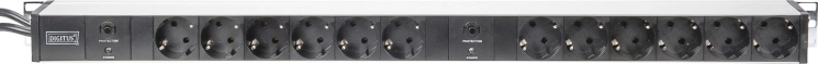 Bezpieczna 19" PDU DIGITUS, 12 gniazd Schuko, idealna do szaf serwerowych z zabezpieczeniem przeciwprzeciążeniowym i aluminiowym profilem.