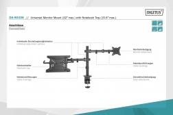 Uchwyt umożliwia indywidualny, oszczędzający miejsce i ergonomiczny montaż monitora o przekątnej do 32''/9 kg oraz laptopa o przekątnej do 15,6''/4 kg. Uchwyt VESA obsługuje: Uchwyt oferuje dwie możliwości montażu: zacisk biurkowy i przelotka są częścią zestawu. Dzięki szybkozłączce płytę VESA można podczas montażu/demontażu przymocować lub odłączyć za pomocą śruby. Dzięki zintegrowanemu prowadzeniu kabli na stanowisku pracy panuje porządek.