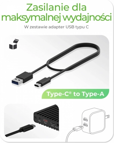 Podłącz przez USB‑C/USB‑A, aby uzyskać błyskawiczne transfery. Przy wysokim obciążeniu można dodać zewnętrzne zasilanie USB‑C dla stabilnej wydajności.