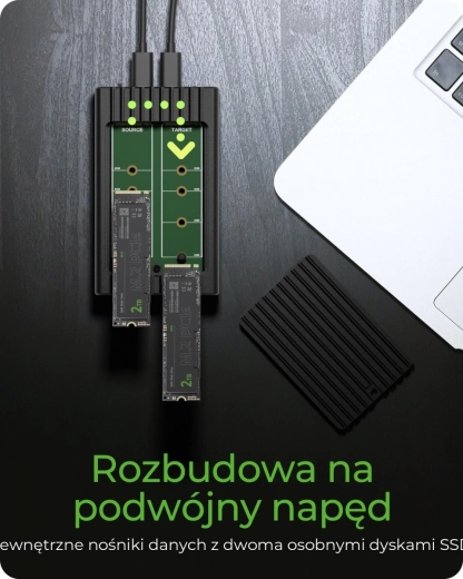 Mieści dwa dyski NVMe SSD i podwaja pojemność Twojej przenośnej pamięci masowej. Idealna do pracy z dużymi projektami i kopiami zapasowymi.