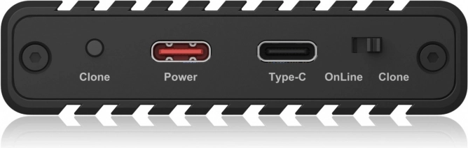 W pełni aluminiowa konstrukcja z żebrowaniem chłodzącym oraz podkładkami termoprzewodzącymi w pokrywie skutecznie odprowadza ciepło nawet przy długotrwałym obciążeniu. Oprócz kombinowanego przewodu USB‑C/USB‑A można dla bardziej wymagających SSD podłączyć także dodatkowe zasilanie przez USB‑C (zasilacz nie jest dołączony).