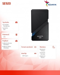Ultraszybki zewnętrzny SSD do wymagających transferów i grania: ADATA SE920 oferuje interfejs USB4 do 40 Gb/s, prędkości do 3800/3700 MB/s, złącze USB‑C, wsparcie Thunderbolt 3/4 oraz opatentowane aktywne chłodzenie z wbudowanym wentylatorem. Świetnie rozszerza pamięć masową dla PS5 i Xboxa, a także do pracy na Windows, macOS i Androidzie.
