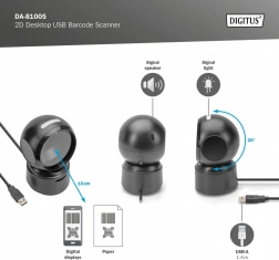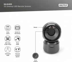 Automatyczny czujnik IR aktywuje skaner, gdy kod znajdzie się w polu widzenia, a sygnalizacja wizualna i dźwiękowa potwierdza udany odczyt. Odporność na zakłócenia gwarantuje niewrażliwość na światło otoczenia, a obrotowa głowica i kompaktowa obudowa oszczędzają miejsce na biurku.
