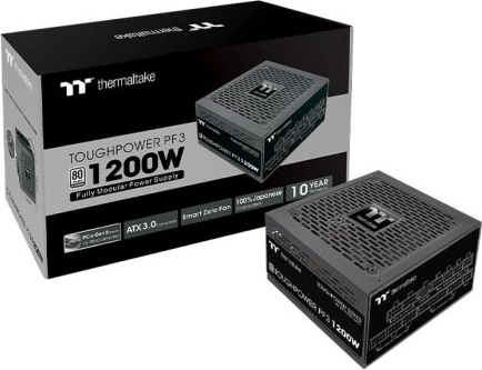 Thermaltake Toughpower PF3 1200W oferuje maksymalną niezawodność i wydajność dzięki specyfikacji ATX 3.0 oraz wbudowanemu 16-pinowemu złączu, wspierającemu najnowsze karty graficzne. Urządzenie wyposażono w funkcję Smart Zero Fan, która zapewnia ciche chłodzenie za pomocą 120‑milimetrowego wentylatora na łożysku. Certyfikat 80 PLUS Platinum gwarantuje wysoką efektywność energetyczną, co oznacza niższe straty energii i mniej ciepła wewnątrz zasilacza.