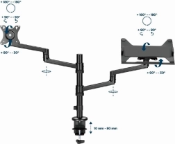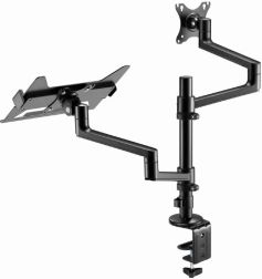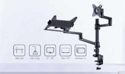 Jedno ramię dla monitora 17–32'' (VESA 75×75/100×100), drugie z półką pod laptop do 17,3''. Oszczędzasz miejsce i zyskujesz perfekcyjnie zorganizowane stanowisko pracy.