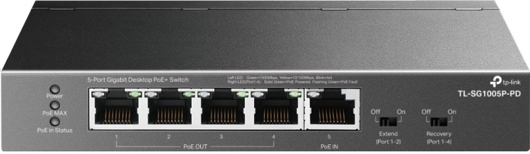 5 portów RJ45 z prędkością 10/100/1000 Mb/s zapewnia wystarczającą przepustowość do podłączenia wielu urządzeń. Wsparcie PoE++ i PoE+ pozwala zasilać urządzenia do 66 W, co jest idealne dla różnorodnych aplikacji.