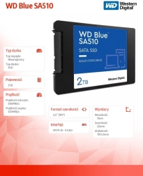 WD Blue SA510 to nowoczesny dysk SATA SSD zaprojektowany dla twórców, profesjonalistów i wymagających użytkowników, którzy chcą przyspieszyć uruchamianie systemu, pracę nad projektami i codzienną produktywność. Dzięki prędkości odczytu do 560 MB/s i niskim opóźnieniom znacząco przyspiesza ładowanie aplikacji oraz pracę z dużymi plikami. Niskie zużycie energii wydłuża czas pracy laptopa na baterii, a konstrukcja bez ruchomych części eliminuje wibracje i zmniejsza ryzyko utraty danych przy upadku.