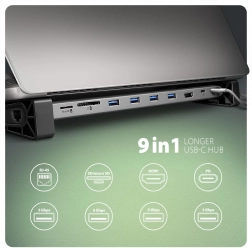 - Stacja 9w1: 4× USB-A, HDMI, RJ-45, SD, microSD, wejście USB-C PD