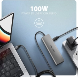 - USB‑C Power Delivery 3.0 do 100 W (tylko zasilanie); zasilanie laptopa przez hub; PD musi wspierać zarówno laptop/telefon, jak i ładowarka