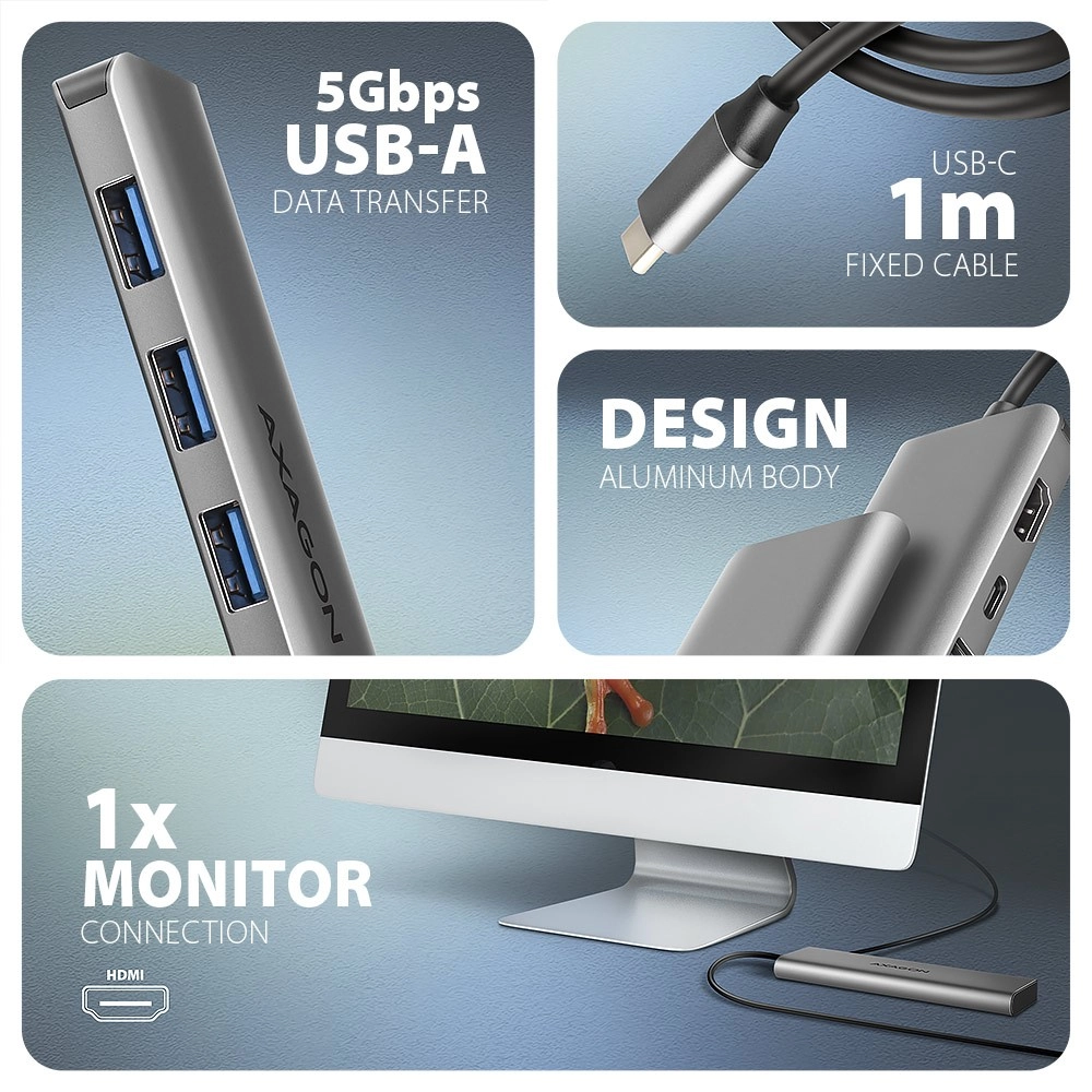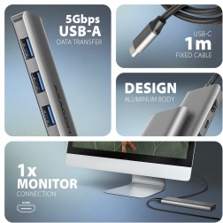 Rozszerz możliwości nowoczesnego laptopa jednym kablem. Ten wieloportowy hub USB‑C oferuje szybkie transfery przez USB 3.2 Gen 1 (5 Gb/s), płynne wyświetlanie przez HDMI do 4K/30 Hz oraz jednoczesne zasilanie przez USB‑C PD 100 W. Dzięki 1‑metrowemu przewodowi zasilającemu masz swobodę rozmieszczenia na biurku.