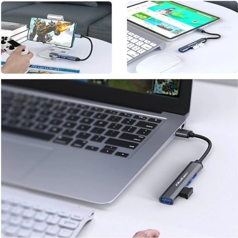 Kompaktowy hub USB‑C 4w1 rozszerza Twój laptop lub komputer o dodatkowe porty do pracy i rozrywki. Oferuje 1× USB 3.0 do szybkiego transferu danych do 5 Gb/s oraz 3× USB 2.0 do podłączania peryferiów. Dzięki złączu USB‑C i funkcji Plug & Play działa od razu, bez instalacji sterowników. Solidne aluminiowe korpus zapewnia trwałość i lepsze odprowadzanie ciepła – idealny do biura, w podróży i do domowej stacji roboczej.