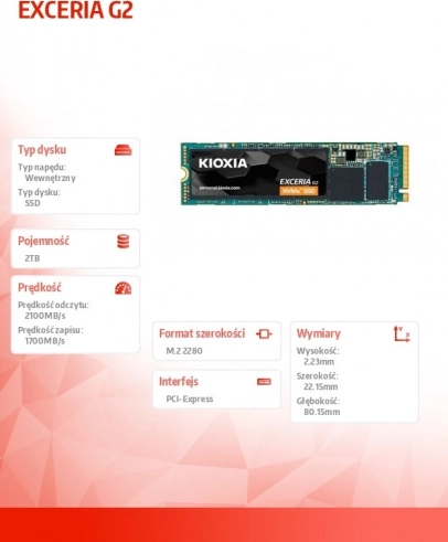 Nowa generacja dysków SSD Kioxia Exceria G2 podnosi wydajność na wyższy poziom. Dzięki maksymalnym sekwencyjnym prędkościom odczytu do 2100 MB/s zapewnia szybsze uruchamianie, transfer plików oraz lepszą ogólną wydajność systemu.