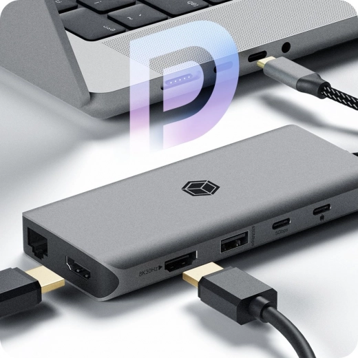 Dwa wyjścia HDMI pozwalają wyświetlić ostry obraz do 8K/30 Hz na jednym monitorze lub jednocześnie obsłużyć 2× 4K (do 60/30 Hz zależnie od możliwości hosta). Technologia DisplayPort Alt Mode zapewnia bezpośrednie, stabilne i wysokiej jakości przesyłanie obrazu oraz dźwięku bez konieczności instalowania sterowników.