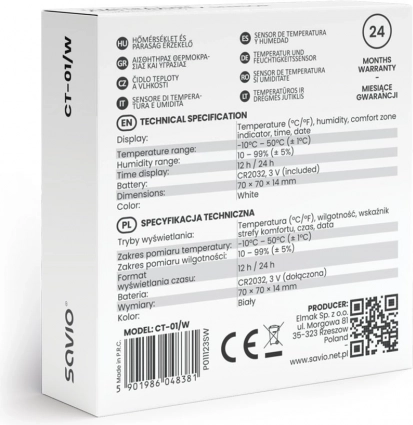 SAVIO CT-01 to wszechstronny pokojowy termometr i higrometr, który wyświetla aktualną temperaturę (°C/°F), wilgotność względną oraz strefę komfortu dla szybkiej oceny warunków wewnętrznych. Duży, dobrze czytelny wyświetlacz LCD uzupełniają czas i data, dzięki czemu wszystkie ważne informacje masz w jednym miejscu.