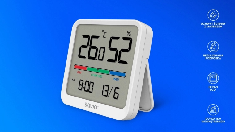 Praktyczny wewnętrzny termometr i higrometr SAVIO CT-01 z czytelnym wyświetlaczem LCD niezawodnie monitoruje temperaturę i wilgotność, wyświetla czas oraz datę, a dzięki wskaźnikowi strefy komfortu pomaga utrzymać idealny klimat w domu i biurze. Eleganckie, kompaktowe wykonanie z magnetycznym uchwytem i regulowaną podstawką umożliwia łatwe umieszczenie w dowolnym miejscu.