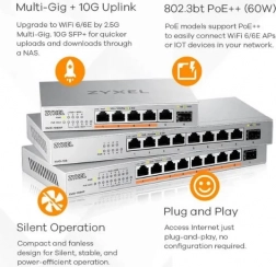 Zyxel XMG-108 to idealny wybór dla graczy, twórców treści i małych biur. Zapewnia pełną przepustowość 2,5G na wszystkich ośmiu portach miedzianych, a dodatkowo 10G SFP+ do podłączenia NAS, serwera lub uplinku do szybkiego szkieletu. Uruchomienie zajmuje chwilę – po prostu podłącz i działaj.