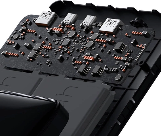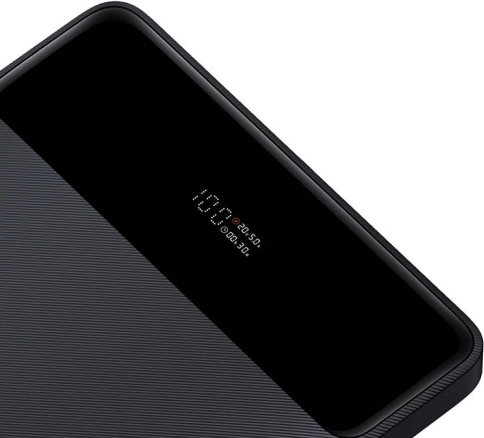 Obudowa jest smukła – tylko 18 mm, a waga wynosi około 490 g, więc łatwo mieści się w torbie lub kieszeni plecaka. Przyjemna faktura, wysokiej jakości materiały ABS+PC oraz wyświetlacz cyfrowy pokazujący procenty i pozostały czas ładowania zwiększają wygodę użytkowania. Technologia Baseus BPS II i wielopoziomowe zabezpieczenia (przed przeładowaniem, przegrzaniem, zwarciem itp.) chronią Twoje urządzenia; nie zabrakło też certyfikatów RoHS, FCC i CE.