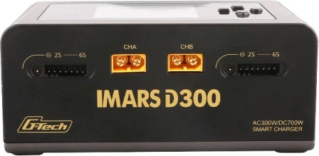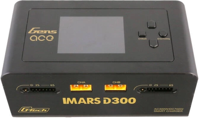 Gens Ace IMARS D300 G‑Tech to inteligentna ładowarka AC/DC zaprojektowana dla akumulatorów G‑Tech Eco oraz standardowych pakietów. Automatycznie rozpoznaje typ baterii G‑Tech, napięcie i zalecany prąd ładowania, dzięki czemu ładowanie jest szybkie, precyzyjne i bezpieczne. Dwa niezależne kanały umożliwiają równoczesne ładowanie dwóch baterii z mocą do AC 300 W lub DC 2×350 W.