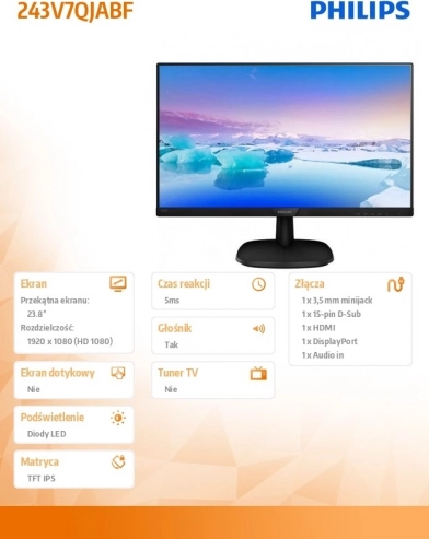 Elegancki monitor 23,8" z technologią IPS zapewnia ostry obraz, stabilny kontrast i znakomite kąty widzenia, co docenisz podczas pracy biurowej, nauki i multimediów. Połączenie przez HDMI oraz DisplayPort gwarantuje uniwersalną kompatybilność z nowoczesnymi urządzeniami.