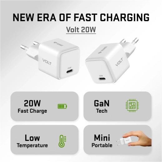 Ta biała ładowarka VOLT z innowacyjną technologią GaN (azotek galu) oferuje zwiększoną efektywność i kompaktowe wymiary do wszechstronnego zastosowania. Dzięki tej technologii ładowarka jest o 30% mniejsza niż tradycyjne modele, a jednocześnie zapewnia moc do 20 W. Jest idealna w podróży lub jako ładowarka zapasowa ze względu na niską wagę i wymiary.
