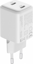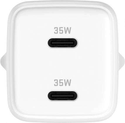 - Dwa porty wyjściowe umożliwiają jednoczesne zasilanie dwóch urządzeń. Pojedynczy port osiąga moc do 35 W, przy jednoczesnym użyciu 17 W dla C1 i 18 W dla C2.