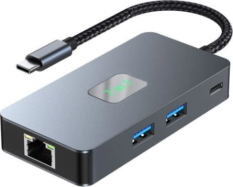 Wieloportowy adapter HUB USB‑C 7 w 1 z HDMI, USB, SD/TF i RJ45 rozszerza możliwości Twojego laptopa. Prędkość do 2500 Mbps.