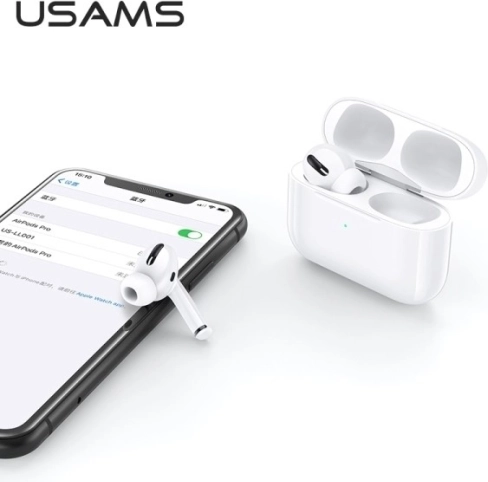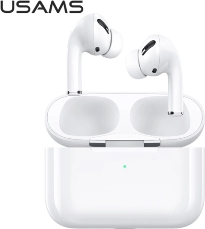 Bezprzewodowe słuchawki USAMS YS Series: Bluetooth 5.0, stabilne połączenie, automatyczne parowanie, sterowanie dotykowe oraz ładowanie Qi i Lightning. W białym kolorze.