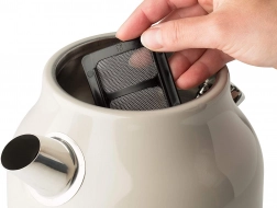 Wyjmowany i zmywalny filtr wychwytuje zanieczyszczenia. Zapewniony zapasowy filtr w zestawie wydłuża żywotność czajnika.