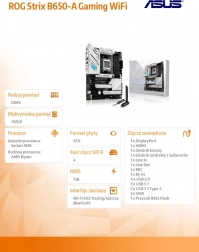 Płyta główna ROG STRIX B650-A Gaming WiFi zapewnia wysoką wydajność, topową odporność termiczną i nowoczesne wyposażenie dla zestawów z procesorami AMD Ryzen 7000. Oferuje PCIe 5.0 M.2, szybkie moduły DDR5 oraz Wi‑Fi 6E dla błyskawicznego połączenia – wszystko w atrakcyjnym czarno‑srebrnym wzornictwie STRIX.