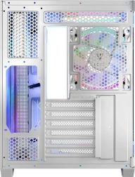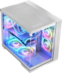 Model Volcano Panorama podąża za najnowszymi trendami w eksponowaniu zainstalowanych komponentów. Jeden panel z hartowanego szkła to za mało – tutaj przygotowaliśmy możliwość pełnoprawnej prezentacji komputera. Drogie karty graficzne, moduły RAM, chłodzenie procesora – szkoda je chować. Jeśli składasz komputer z starannie dobranych podzespołów, wiemy, jak ważne jest, by móc je pokazywać w pełnym świetle. Przygotowaliśmy kilka wersji modelu, między innymi z nawet siedmioma, pięcioma lub trzema preinstalowanymi wentylatorami, co daje szerokie możliwości konfiguracji. Wybierając Volcano Panorama zyskujesz przede wszystkim możliwość montażu płyt głównych z odwróconymi złączami, dużo miejsca na komponenty – długie karty graficzne i wysokie chłodzenie CPU, złącze USB-C i dwa złącza USB 3.0 oraz dwukomorową konstrukcję, w której pionowo montowany zasilacz jest oddzielony od części montażowej. Całość zamknięta jest w dwóch szklanych panelach dla najlepszego efektu.