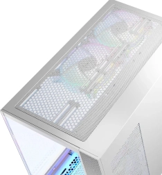 Często przy wyborze obudowy trzeba iść na kompromisy – albo będzie ładna, albo przewiewna. W przypadku Volcano Panorama nie przewidujemy kompromisów. Dlatego nowoczesny design idzie w parze z dobrym przepływem powietrza. Wentylowany górny panel, wentylowana część po stronie serwisowej oraz od spodu, z odpowiednim rozmieszczeniem wentylatorów, pozwalają utrzymać niskie temperatury całego komputera nawet podczas intensywnego i długiego grania.