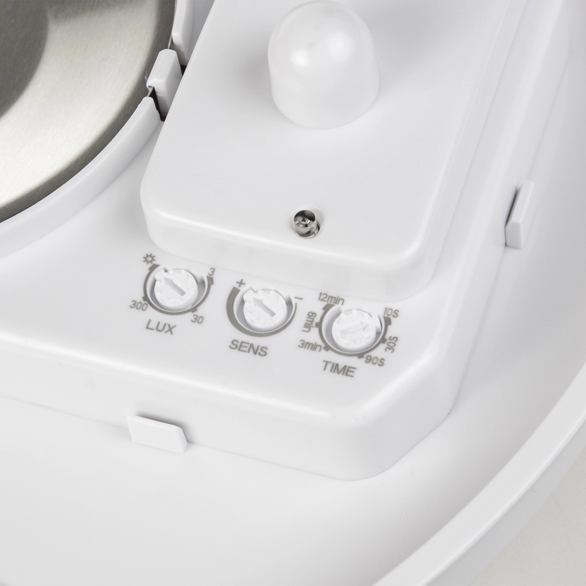 Nowoczesna lampa sufitowa z mikrofalowym czujnikiem ruchu do automatycznego włączania przy wykryciu osoby. Dzięki czujnikowi zmierzchu świeci tylko wtedy, gdy jest to potrzebne, co zapewnia oszczędność energii i dłuższą żywotność źródeł światła. Ustawienia TIME, LUX i SENS pozwalają dopasować czas świecenia, czułość na światło otoczenia oraz zasięg detekcji zarówno dla małych, jak i dużych pomieszczeń.