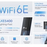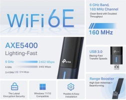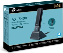 Dzięki tej wydajnej, trójzakresowej USB karcie sieciowej możesz korzystać z pasm 2.4 GHz, 5 GHz i 6 GHz, co zapewnia elastyczne połączenie bezprzewodowe. Anteny o wysokim zysku wraz z technologią Beamforming rozszerzają zasięg Wi‑Fi, dzięki czemu możesz łączyć się z dowolnego miejsca w domu. Niskie opóźnienia w grach są osiągane dzięki technologiom OFDMA i MU‑MIMO, które zapewniają maksymalnie efektywne połączenie z Twoim komputerem.