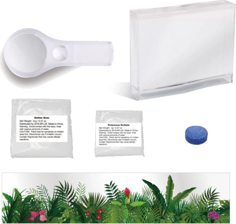 Opakowanie zawiera wszystko, co niezbędne do rozpoczęcia przygody: akwarium, żel odżywczy, lupę, naklejkę z roślinami i instrukcję. Zalecane dla dzieci od 8 lat.