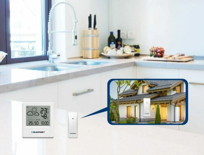 Stację możesz postawić lub powiesić dzięki otworowi na haczyk z tyłu. Zasilanie bateryjne (w zestawie dla stacji i czujnika) ułatwia umieszczenie w dowolnym miejscu bez kabli. Zewnętrzny czujnik zamontuj w cieniu, osłonięty przed deszczem i wiatrem, aby uzyskać jak najdokładniejsze pomiary. Zintegrowany tryb zegara 12/24 h uzupełnia funkcjonalne wyposażenie.