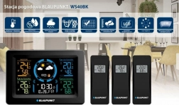 Inteligentna stacja meteorologiczna BLAUPUNKT WS40BK z kolorowym wyświetlaczem LCD i nawet czterema jednoczesnymi pomiarami (1 wbudowany + 3 bezprzewodowe czujniki) zapewni, że zawsze będziesz mieć na oku temperaturę, wilgotność, ciśnienie atmosferyczne, trend pogody oraz fazy Księżyca. Oferuje precyzyjne czujniki, historię min/max, zegar 12/24 h z kalendarzem, budzik z funkcją drzemki oraz ściemniane podświetlenie. Zasilanie możliwe z sieci i z baterii.
