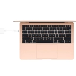 Złoty laptop o nowoczesnym wzornictwie pokazuje, jak adapter prezentuje się po podłączeniu do stylowego urządzenia, podkreślając jego walory estetyczne.
